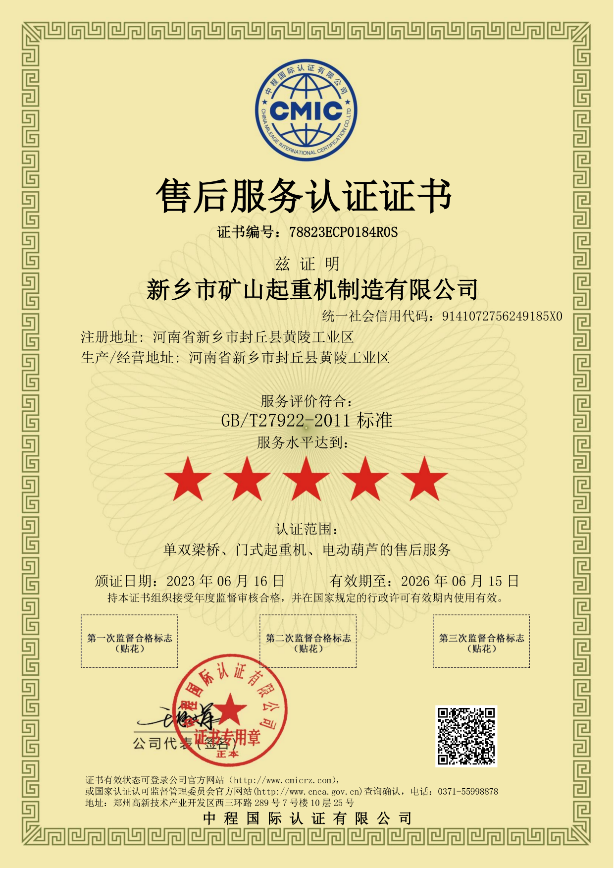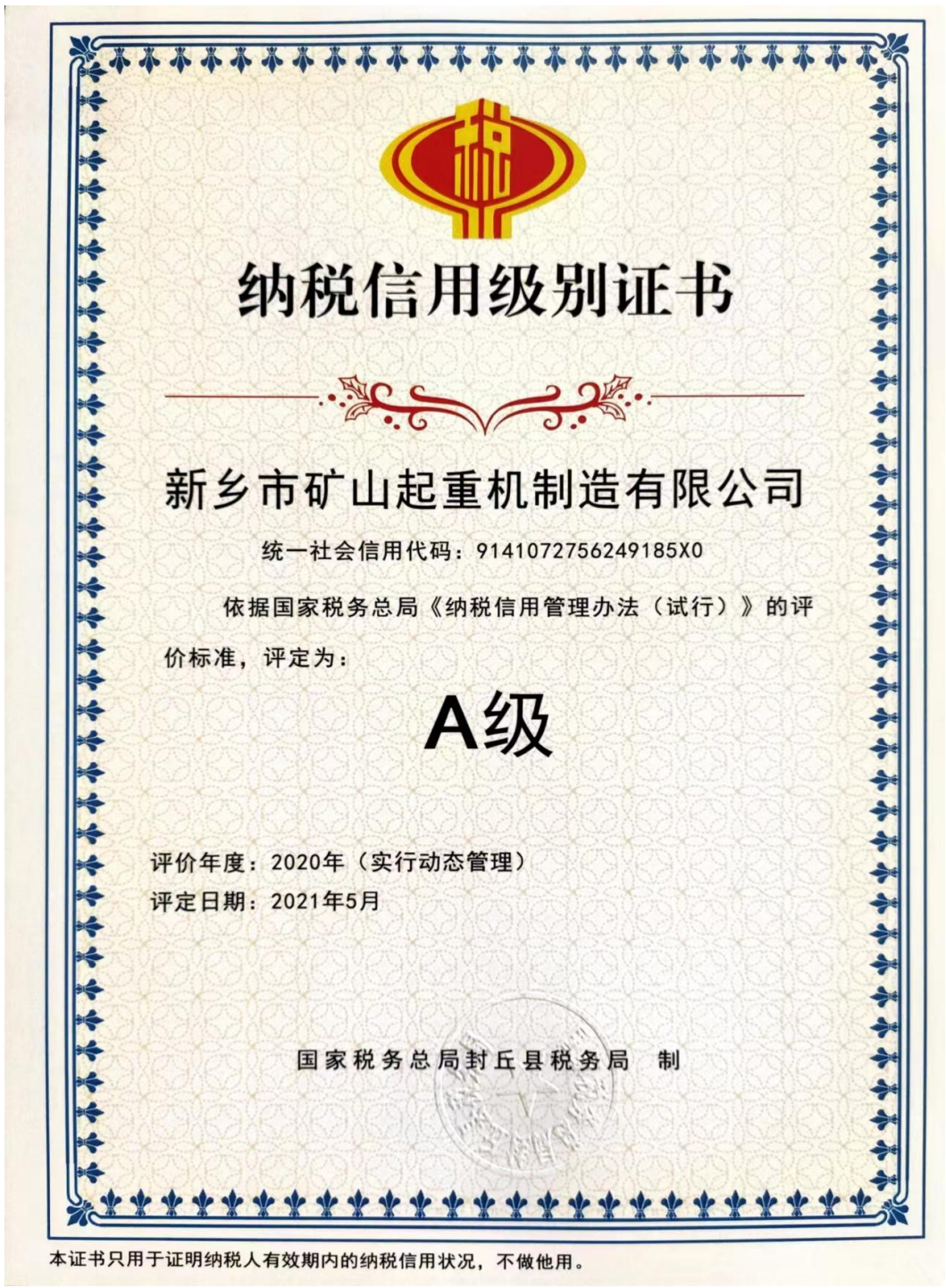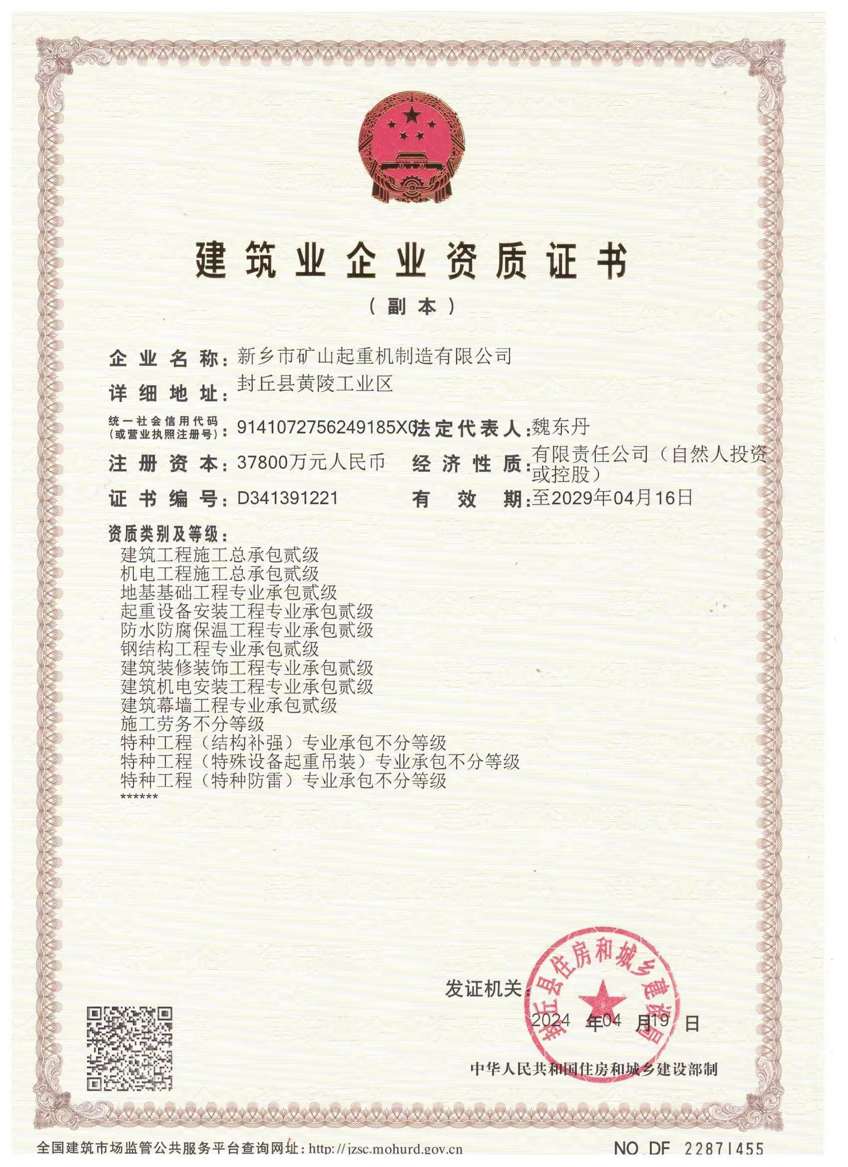 國(guó)家頒發(fā)A 級(jí)證書,河南建設(shè)廳頒發(fā)的安全生產(chǎn)許可證,封丘縣人民政府頒發(fā)制造業(yè)稅收突出貢獻(xiàn)獎(jiǎng),河南省安全生產(chǎn)監(jiān)督管理局頒發(fā)安全生產(chǎn)標(biāo)準(zhǔn)化,歐盟出口證書,建筑企業(yè)資質(zhì)證書,通過了“1S09001-2008國(guó)際質(zhì)量管理體系”認(rèn)證“GB/T24001-2004環(huán)境管理體系”認(rèn)證“GBT/28001-2009國(guó)際職業(yè)健康安全管理體系”認(rèn)證。獲得了“誠(chéng)信守法企業(yè)”、“重合同守信企業(yè)”、“全 面質(zhì)量達(dá)標(biāo)企業(yè)”、“質(zhì)量信得過產(chǎn)品”等諸多殊榮。
